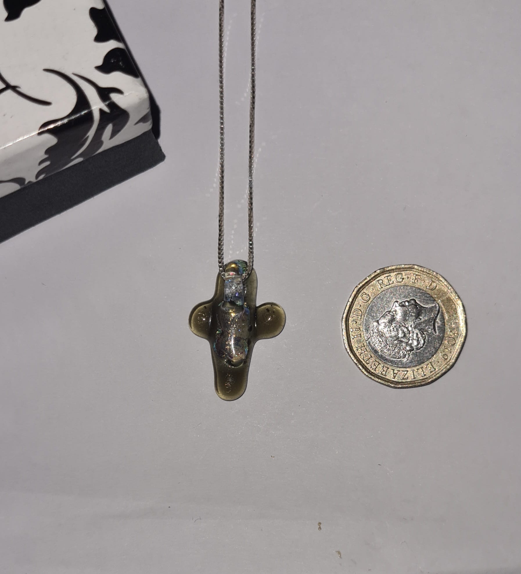 Fused glass pendant, handmade by Joe’s mum. Veronica. Made with a grey/taupe coloured transparent glass and a little added silver sparkly dichroic glass.