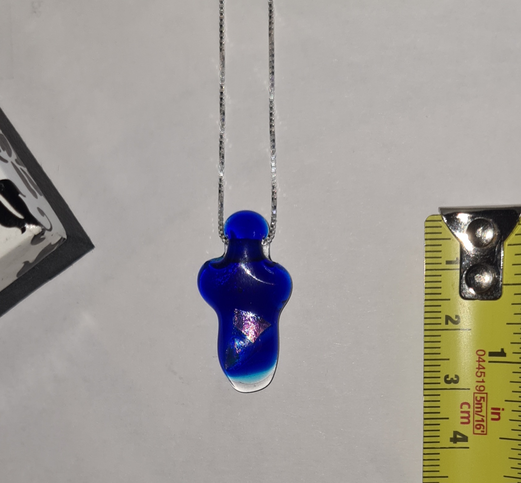 Fused glass pendant, handmade by Joe’s mum, Veronica. Made with a lovely blue coloured transparent glass and a little added sparkly pink dichroic glass.